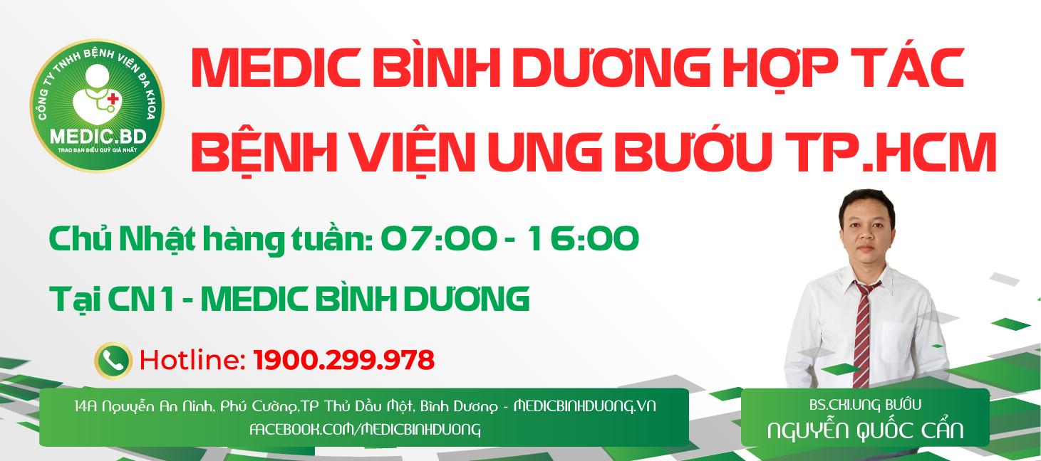 Ở tỉnh Bình Dương, việc người bệnh phải di chuyển xuống các bệnh viện tại thành phố Hồ Chí Minh để khám, chữa bệnh là điều hết sức khó khăn, tốn rất nhiều thời gian và chi phí đi lại. Hiểu được tình trạng trên, Bệnh viện đa khoa Medic Bình Dương đã hợp tác với Bác sĩ CKI Nguyễn Quốc Cẩn - Chuyên khoa Ung Bướu, Bệnh viện Ung Bướu thành phồ Hồ Chí Minh trực tiếp thăm khám vào chủ nhật hàng tuần từ 07h00 - 16h00 tại bệnh viện đa khoa Medic Bình Dương - Chi nhánh 01.