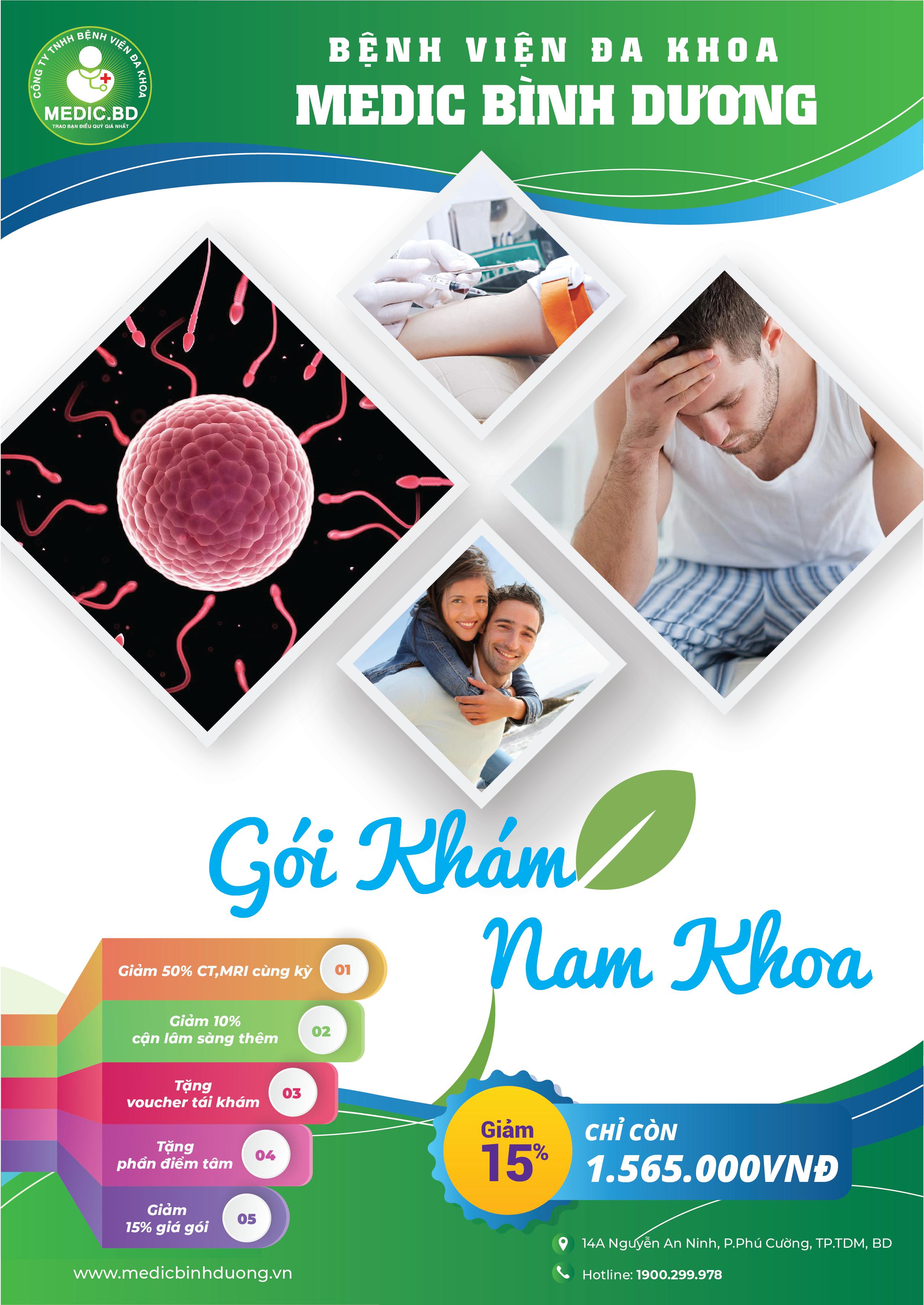 Ngoài ra, Gói khám Nam khoa chính là 1 “trợ thủ” đắc lực giúp nam giới giải tỏa được mọi âu lo về các bệnh lý nam khoa. Thực hiện gói khám nam khoa, Quý Khách hàng sẽ yên tâm hơn về sức khỏe, phòng ngừa các bệnh lý có thể xảy ra, điều trị kịp thời, không làm ảnh hưởng đến sức khỏe sinh sản và chất lượng cuộc sống hôn nhân gia đình. Gói Khám Nam khoa tại Bệnh viện đa khoa Medic Bình Dương đang có chương trình khuyến mãi 15%.