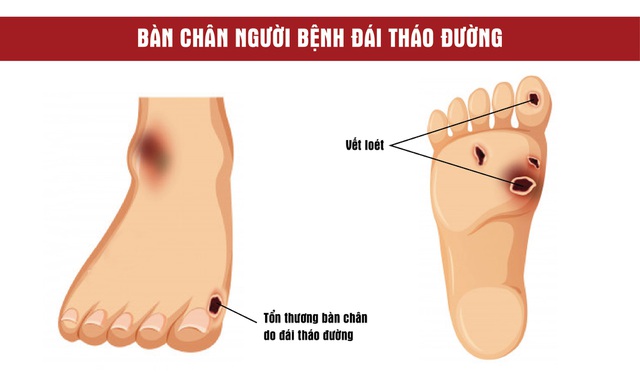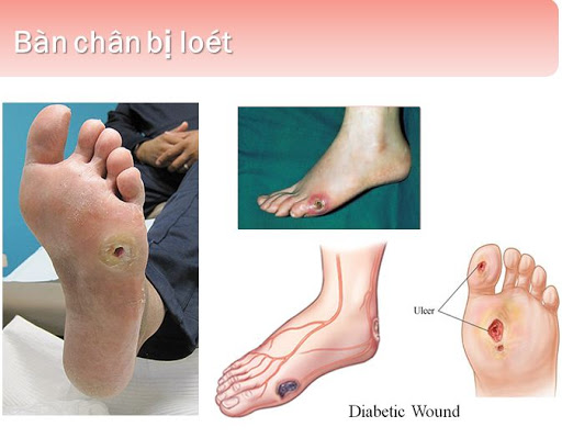 » Loét do tiểu đường: Loét bàn chân tiểu đường là những vết thương hở ở bàn chân gặp ở 10% người bệnh tiểu đường. Vết loét thường nằm ở các vị trí hay bị tì đè như gan bàn chân, đầu ngón chân, đặc biệt là ngón cái và ngón út. Loét chân có thể xảy ra từ những vết xước nhỏ, vết cắt lành chậm hoặc do sự cọ xát của giày có kích cỡ không phù hợp.