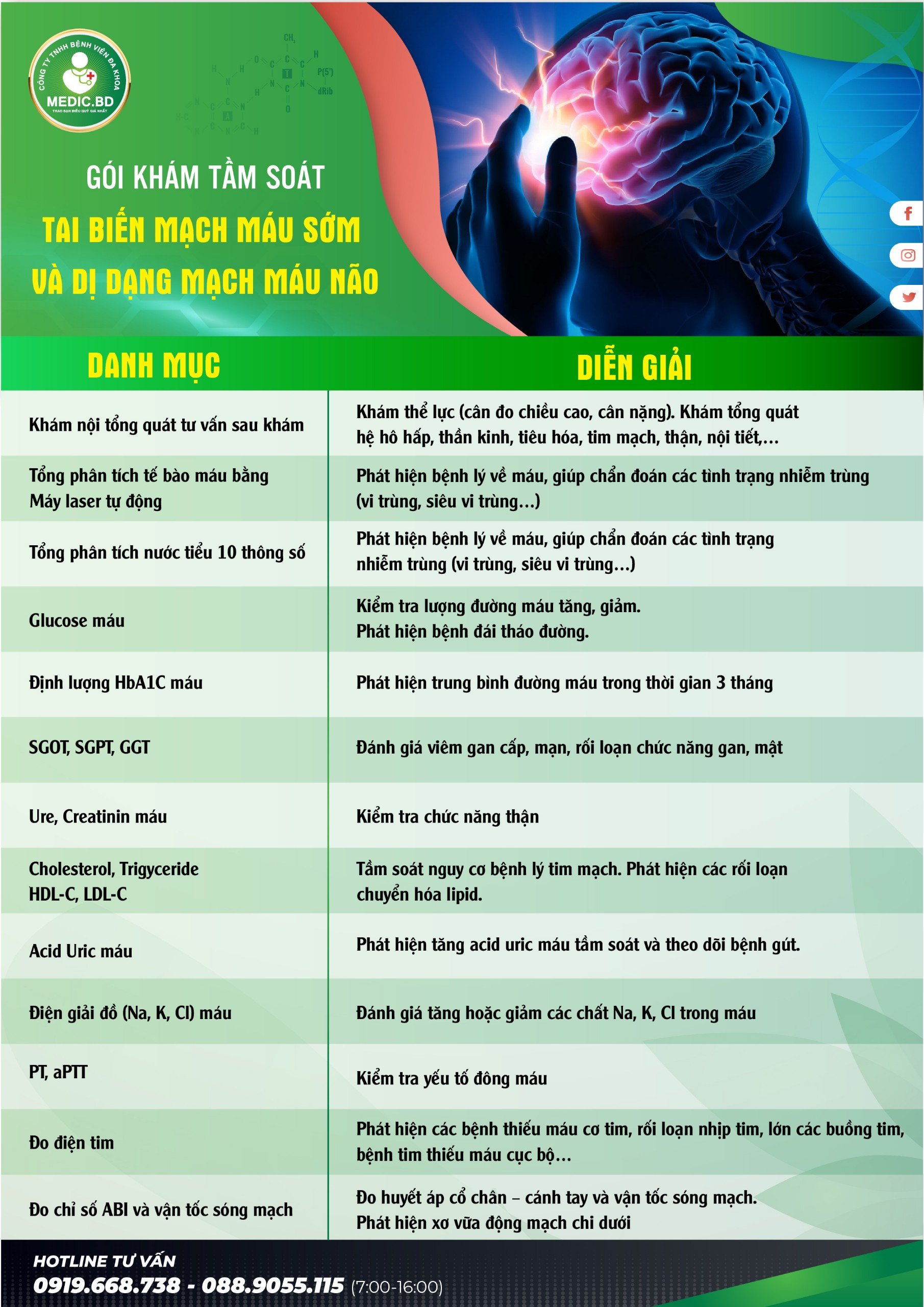 Gói khám tai biến mạch máu sớm và dị dạng mạch máu não tại Bệnh viện Medic Bình Dương bao gồm một loạt các kiểm tra toàn diện để đánh giá sức khỏe của não và mạch máu, từ đo lường huyết áp đến MRI và CT scan để phát hiện sớm bất kỳ vấn đề nào có thể tồn tại.