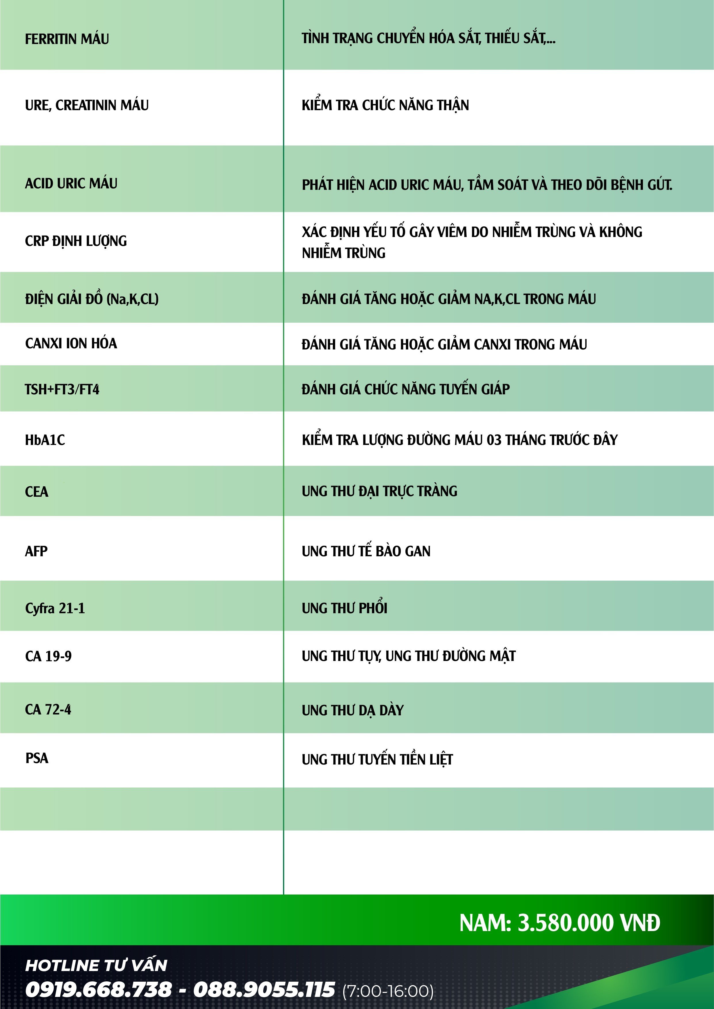 – Kiểm tra dấu ấn ung thư ( Đại trực tràng, Gan, Tụy, Dạ dày, Tuyến tiền liệt, Phổi )