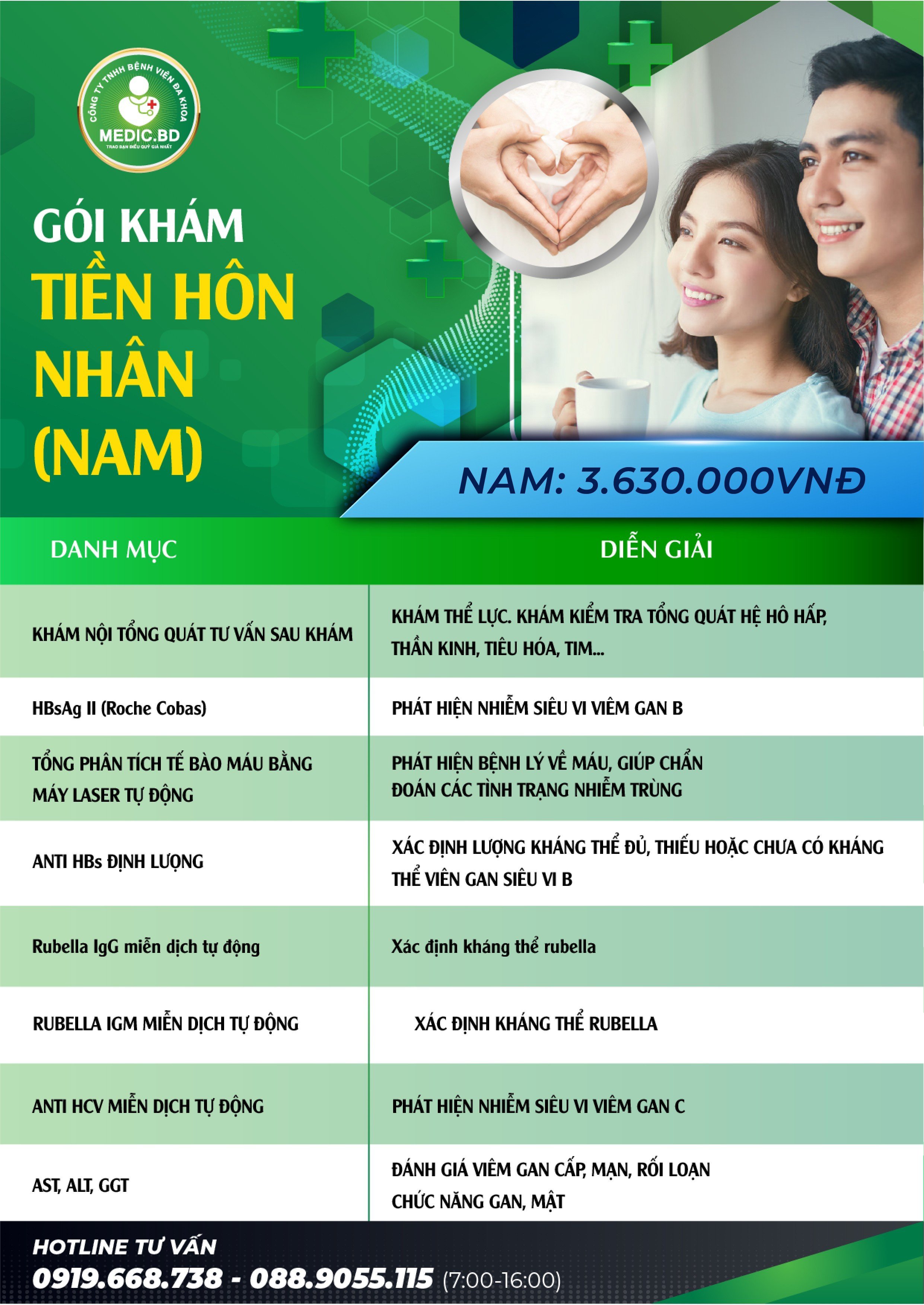Đây là gói khám sức khỏe rất cần thiết cho những cặp đôi có ý định kết hôn, giúp phát hiện những vấn đề cũng như rủi ro sức khỏe tiềm ẩn cho bản thân và cho con cái trong tương lai.