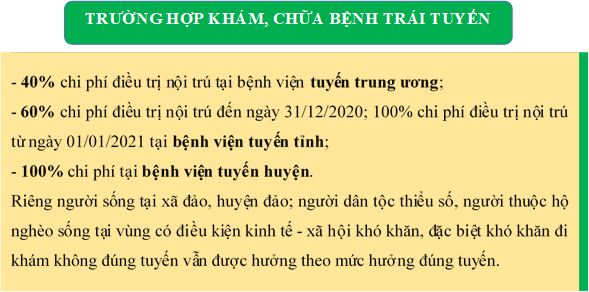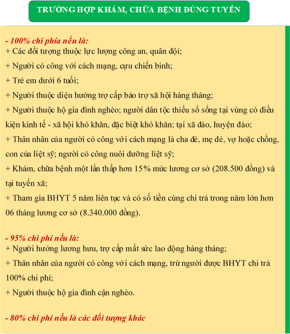 - Người thuộc hộ gia đình nghèo; người dân tộc thiểu số đang sinh sống tại vùng có điều kiện kinh tế - xã hội khó khăn, người đang sinh sống tại vùng có điều kiện kinh tế - xã hội đặc biệt khó khăn; người tham gia BHYT đang sinh sống tạ xã đảo, huyện đảo khi tự đi KCB không đúng tuyến được quỹ BHYT thanh toán chi phí KCB đối với bênh viện tuyến huyện, điều trị nội trú với bệnh viện tuyến tỉnh, tuyến trung ương và có mức hưởng 100% chi phí khám, chữa bệnh.