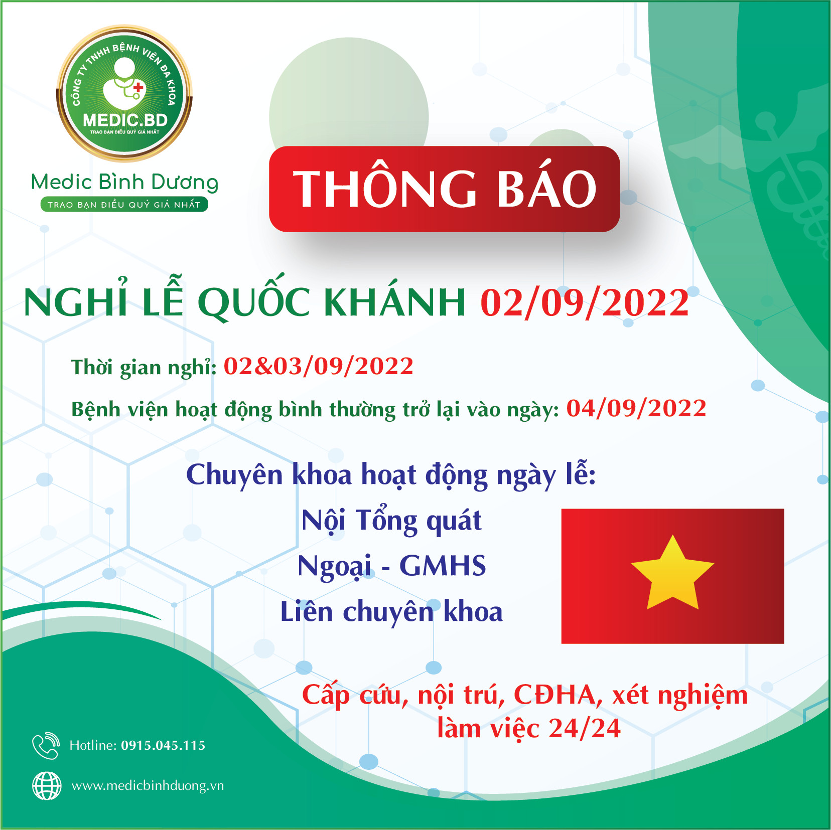 Thông báo về hoạt động khám chữa bệnh vào dịp Lễ Quốc Khánh 02/09/2022 tại bệnh viện đa khoa Medic Bình Dương