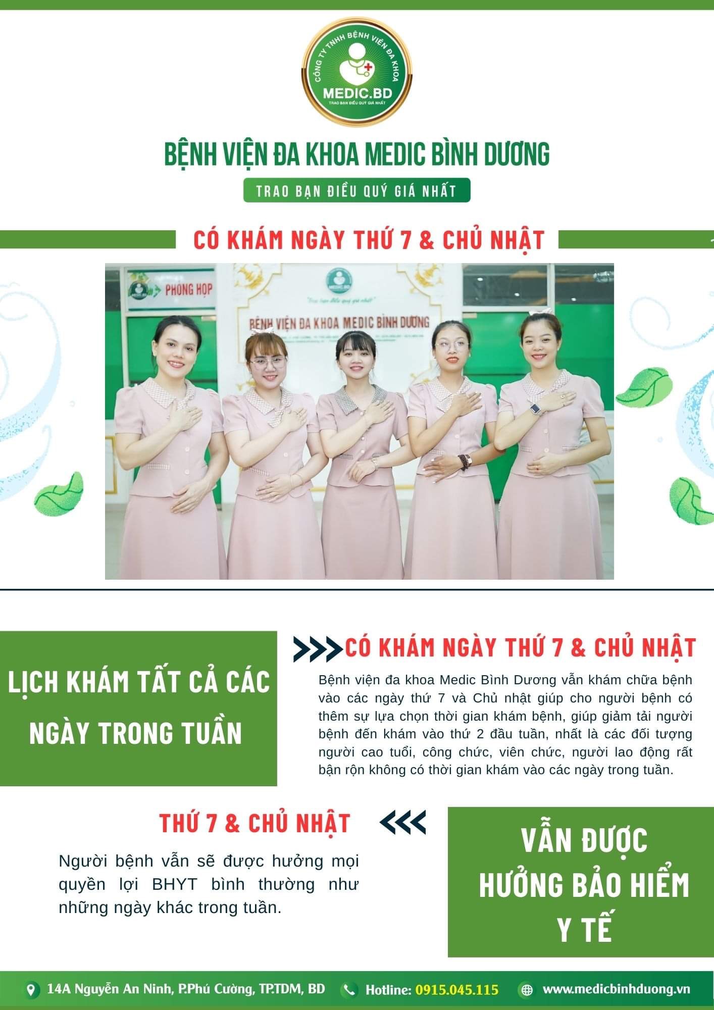 Bệnh viện đa khoa Medic Bình Dương vẫn khám chữa bệnh vào các ngày thứ 7 và Chủ nhật giúp cho người bệnh có thêm sự lựa chọn thời gian khám bệnh, giảm tải người bệnh đến khám vào thứ 2 đầu tuần, nhất là các đối tượng người cao tuổi, công chức, viên chức, người lao động bận rộn không có thời gian khám vào các ngày trong tuần.