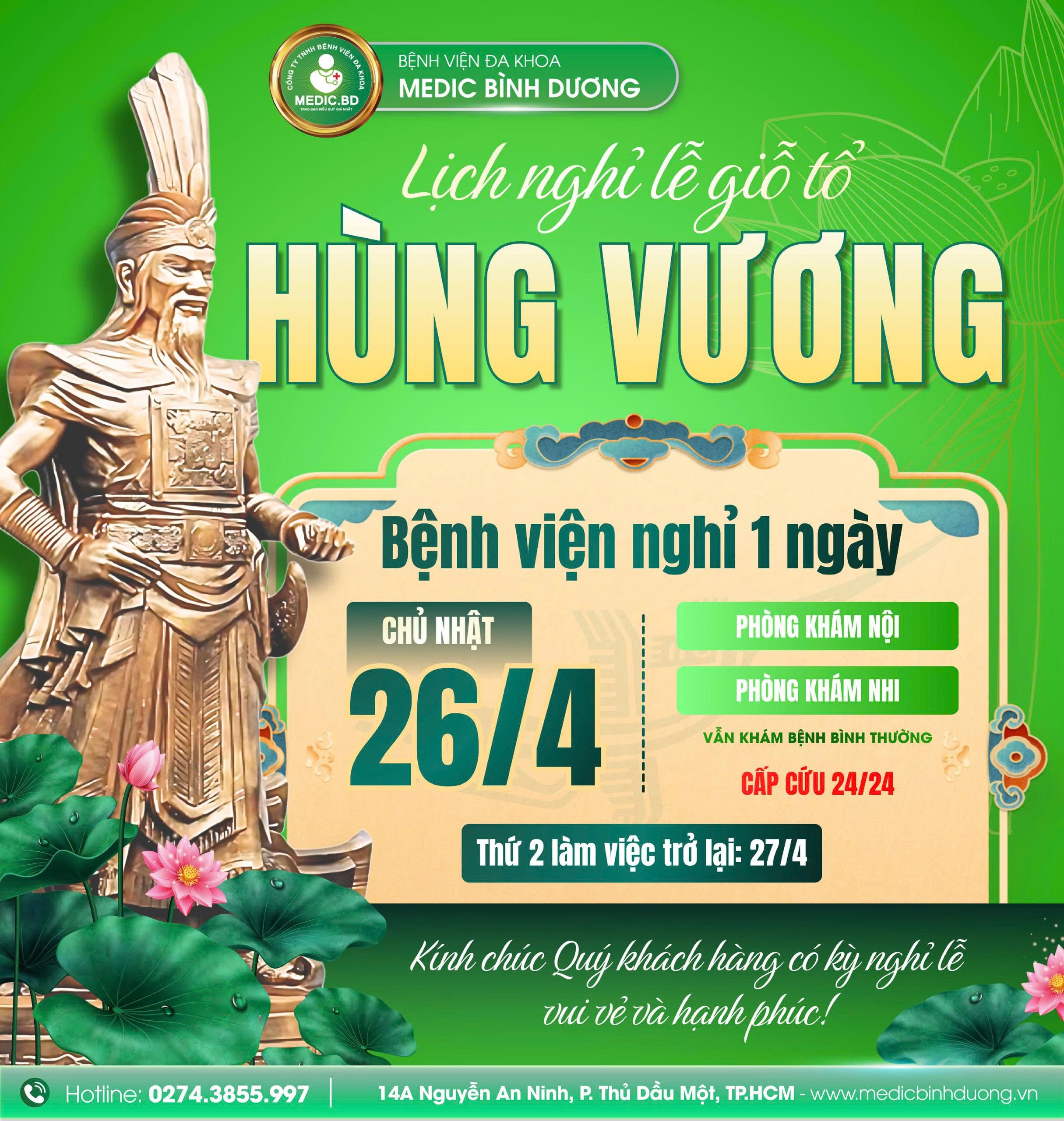 Bệnh viện đa khoa Medic Bình Dương trân trọng thông báo đến toàn thể Quý khách hàng về việc khám chữa bệnh ngày Giỗ Tổ Vua Hùng.