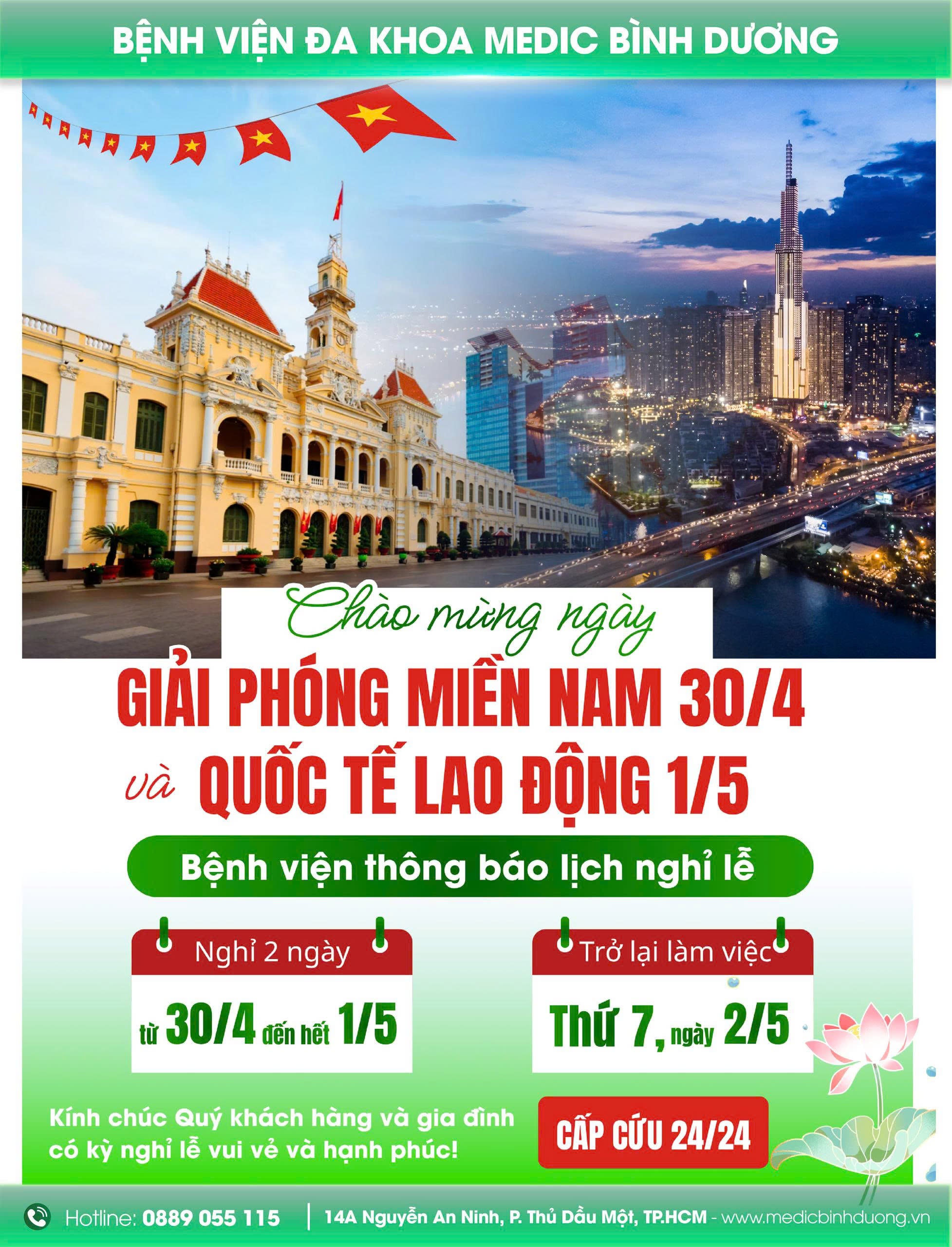 Nhân dịp Ngày Giải phóng miền Nam (30/4) và Quốc tế Lao động (1/5), Bệnh viện Đa khoa Medic Bình Dương xin trân trọng thông báo lịch nghỉ lễ