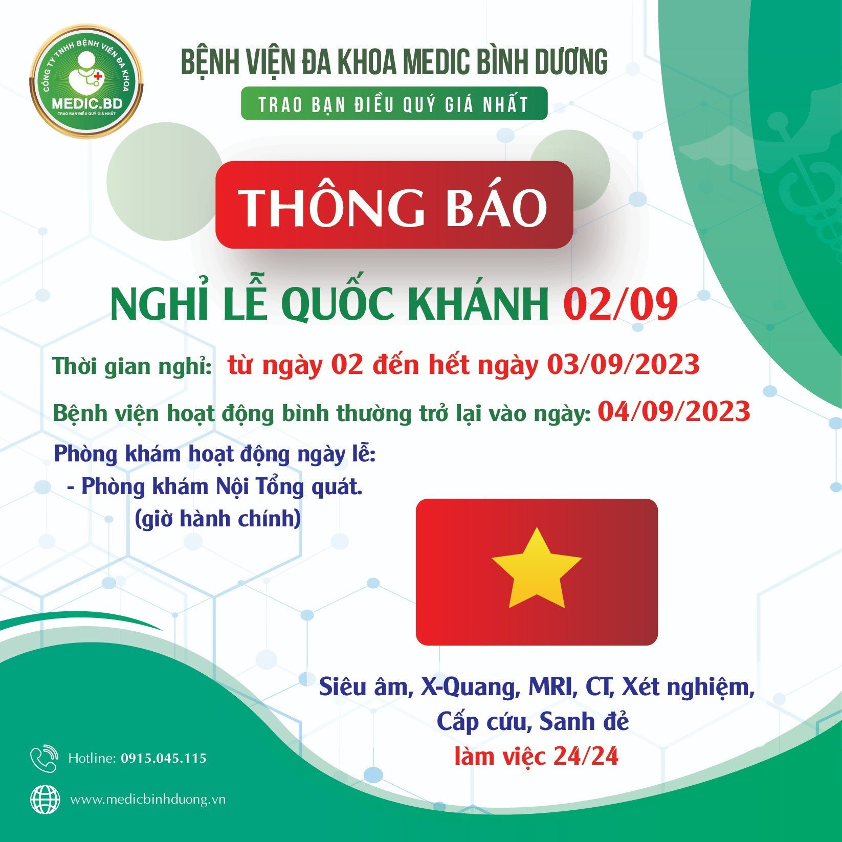 Nghỉ Lễ từ 07h00, thứ 7 ngày 02/09/2023 - hết ngày 03/09/2023. Thứ 2 ngày 04/09/2023, bệnh viện đa khoa Medic Bình Dương trở lại hoạt động bình thường.