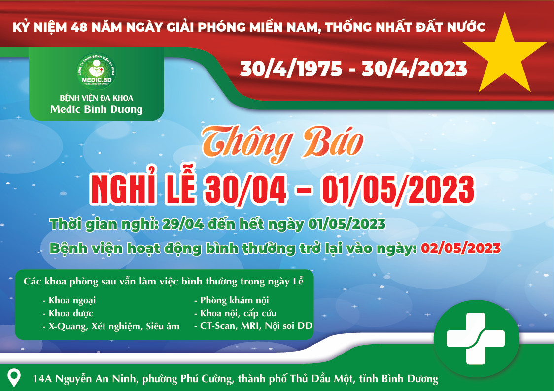 Bệnh viện đa khoa Medic Bình Dương xin trân trọng thông báo lịch nghỉ lễ Giỗ Tổ Hùng Vương, ngày Giải phóng Miền Nam và Quốc tế lao động 30/4 -1/5 đến toàn thể Quý Khách hàng như sau: