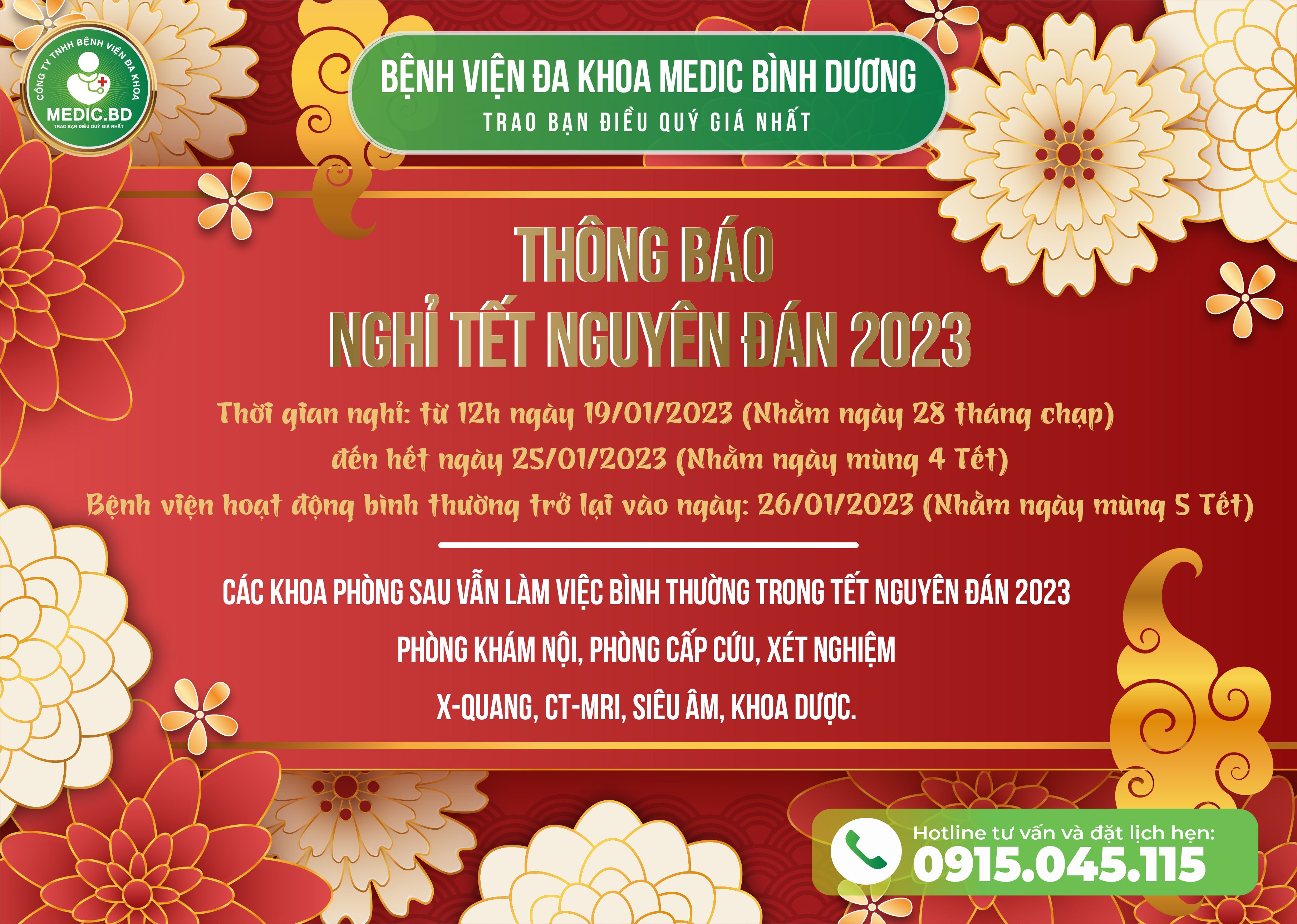 Nhằm để Quý khách chủ động trong việc khám chữa bệnh dịp Tết QUÝ MÃO 2023. Nay Ban Giám Đốc Bệnh viện đa khoa Medic Bình Dương thông báo đến toàn thể Quý Khách hàng lịch nghỉ Tết Nguyên Đán 2023 như sau: