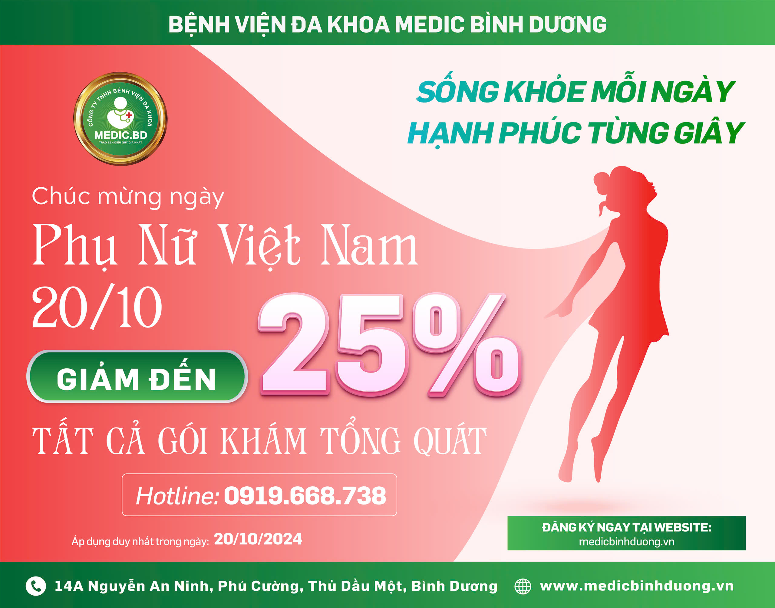 Kỷ niệm ngày Phụ Nữ Việt Nam (20/10), Bệnh viện Đa khoa Medic Bình Dương xin gửi đến quý khách hàng ưu đãi đặc biệt nhằm chăm sóc, tầm soát sức khỏe của quý vị và gia đình.