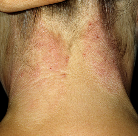 Ngứa là triệu chứng điển hình nhất, thường xuất hiện ở vùng cổ, nhưng cũng có thể gặp ở cánh tay, mí mắt, da đầu, mông hoặc vùng sinh dục. Cơn ngứa thường rõ rệt hơn vào ban đêm, đặc biệt khi người bệnh chuẩn bị đi ngủ, và có xu hướng nặng hơn khi căng thẳng, lo âu.